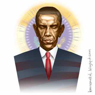 We are doing all in our power to hasten the arrival of that day and we intend to make Mr. Fairey our partner in this endeavor, whether he likes it or not. It is not that we disrespect him. On the contrary, despite his moral confusion, we admire his talent and idealism. But the stakes are far too high to allow his deification of Mr. Obama to go unchallenged. So we urge Mr. Fairey to keep cranking out the posters and we will keep ripping them off. And by the way, Mr. Fairey isn’t the only producer of presidential paeans. “Artists” such as Boy George are composing and performing liturgical hymns with titles like “Yes We Can” . It doesn’t hold up very well against an offering called (caution; sleeze warning) “Crush On Obama” but it does seem to have to have found its own audience. And Mr. Fairey also has competion from other artists but it turns out to be the photojournalists who are the most prolific progenitors of Obama icons. We are eager to desecrate them as fast as they can be consecrated. See if you can distinguish the genuine article from the counterfeit messianic icons.